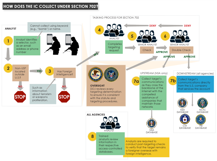 After Edward Snowden leaked NSA slides in 2013, two names became synonymous with the agency’s vast online spying powers: Upstream and PRISM. Both also fall under a surveillance authority known as Section 702 , a provision of law that was enacted by the FISA Amendments Act of 2008. In early 2017, the intelligence community rebranded these two kinds of surveillance, referring to them as “upstream” and “downstream.” The names may have changed, but the surveillance is the same. Upstream surveillance involves collecting communications as they travel over the Internet backbone, and downstream surveillance (formerly PRISM) involves collection of communications from companies like Google, Facebook, and Yahoo. - Upstream vs. PRISM