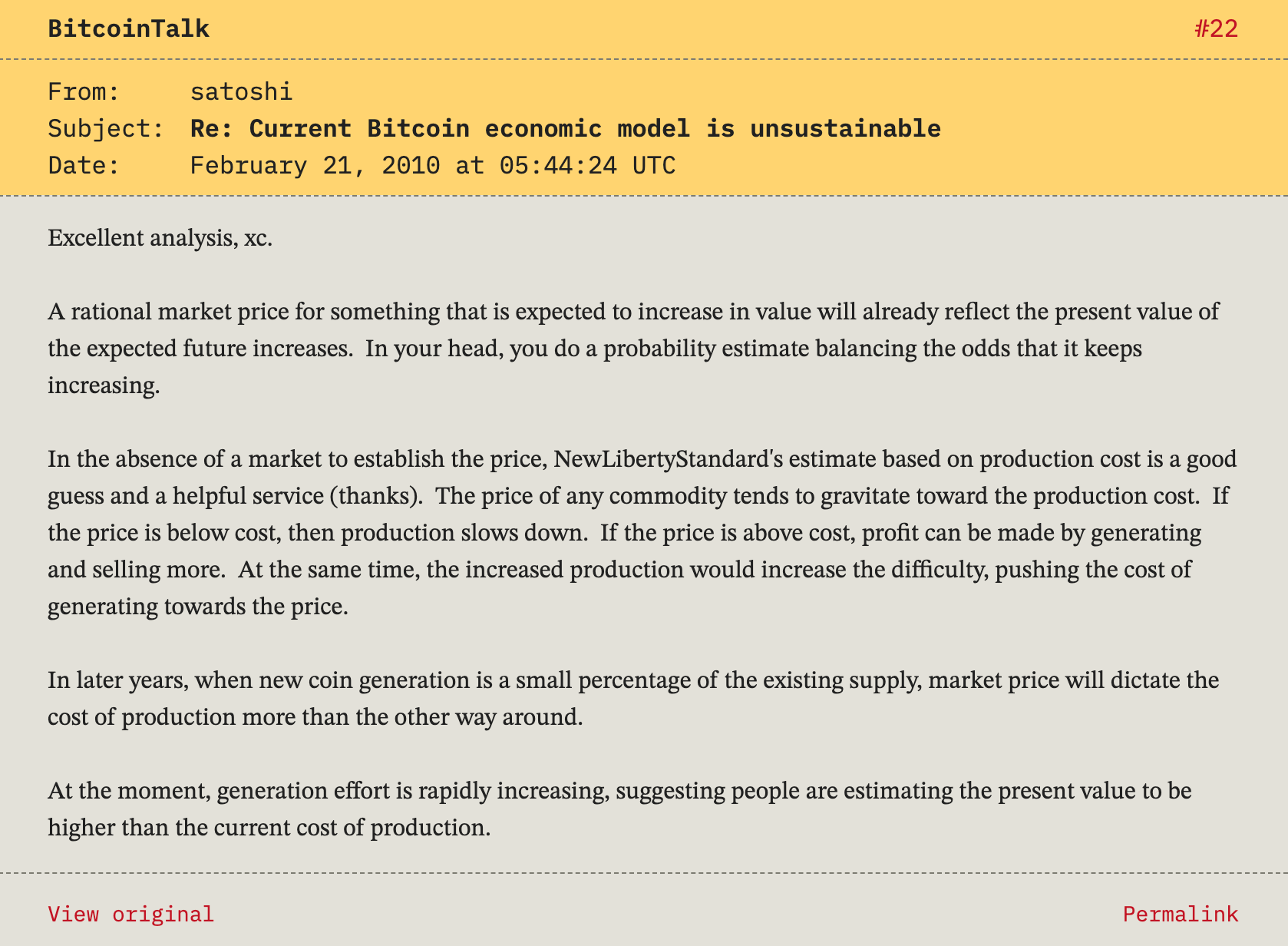 Satoshi’s 2010 reply was not a culture essay. It was mechanism first.